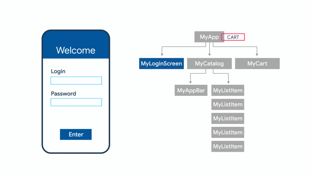 As can be seen in the animation above, it shows how the mobile application is navigated. On the catalog screen, a product is added to the cart. This requires state management because the state of the mobile application is being adjusted. The mobile application needs to know that a product is added to the cart so that the products that are in the cart can be shown on the cart page.